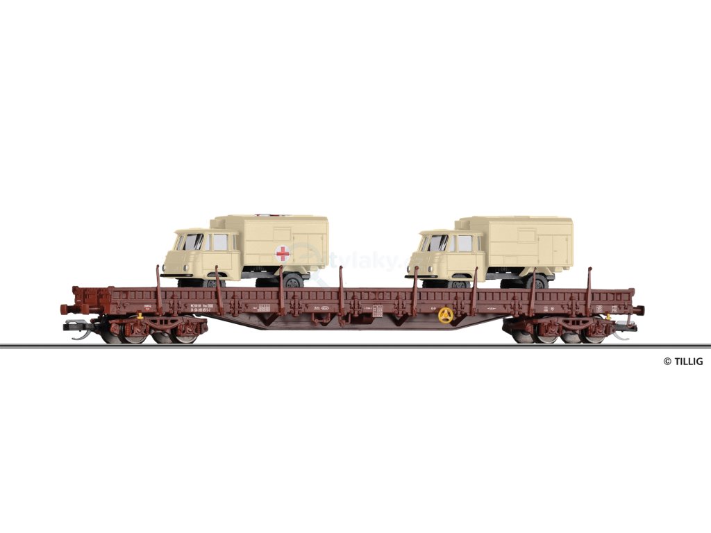 Nízkostěnný vůz DR Res 3936, naložený dvěma nákladními vozy Robur 1801 v exportní verzi, Era IV