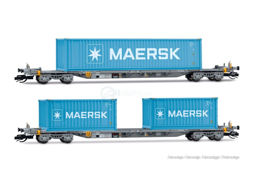 Set dvou čtyřnápravových kontejnerových vozů, lakovaných šedou barvou, naložených 2 x 20' + 1 x 40' kontejnery „MAERSK“, Era VI.