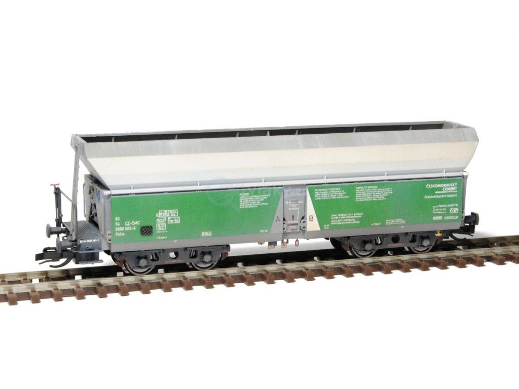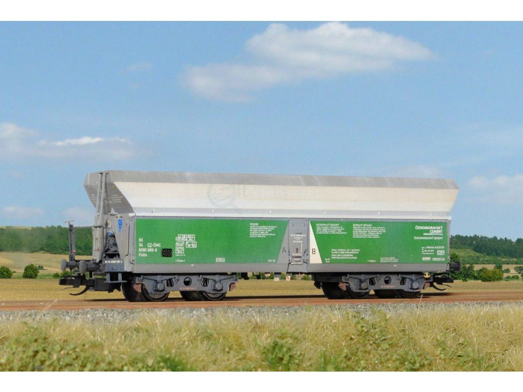 Kompletní stavebnice samovýsypného vozu. Obsahuje plastikové výlisky na sestavení modelu včetně kinematik, spřáhel a kvalitních soustružených kovových dvojkolí, kovové lepty, závaží a obtisky. Provozovatel Českomoravský cement, V.-VI. epocha.