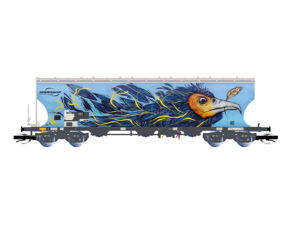 HN9775 F-ERSA, čtyřnápravový vůz na obilí s kulatými bočnicemi, „Interfracht“, s graffiti ptáka