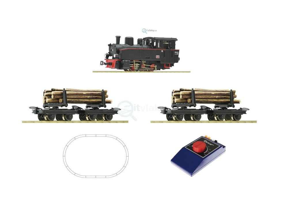 Startset obsahující parní lokomotivu + 2 oplenové vozy s nákladem dřeva, kolejový ovál, trafo.