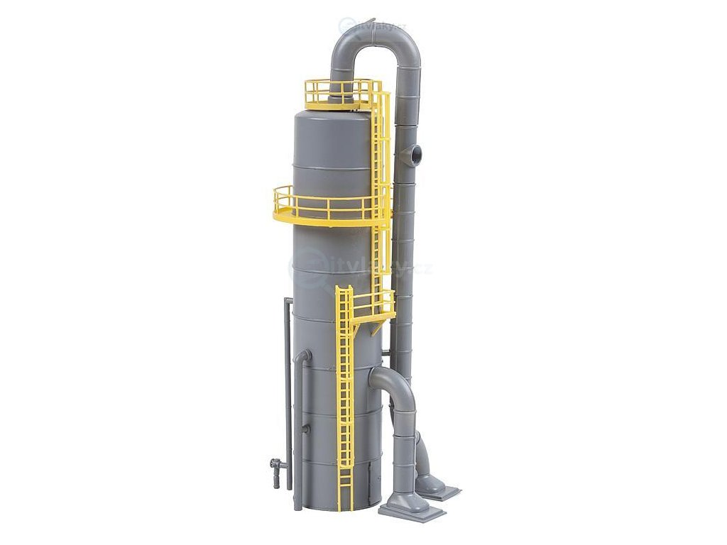 Pro oddělování směsí látek v oblasti tepelné techniky. 1 příklad průmyslové kolony v její typické podobě se dvěma plošinami, žebříky, lampou a potrubím, kterým se oddělují směsi na hlavní a spodní produkt. Pro znázornění izolace tří nebo více složek látek lze model rozšířit a modulárně kombinovat, např. s čl. 180330, průmyslovou vysokou nádrží.