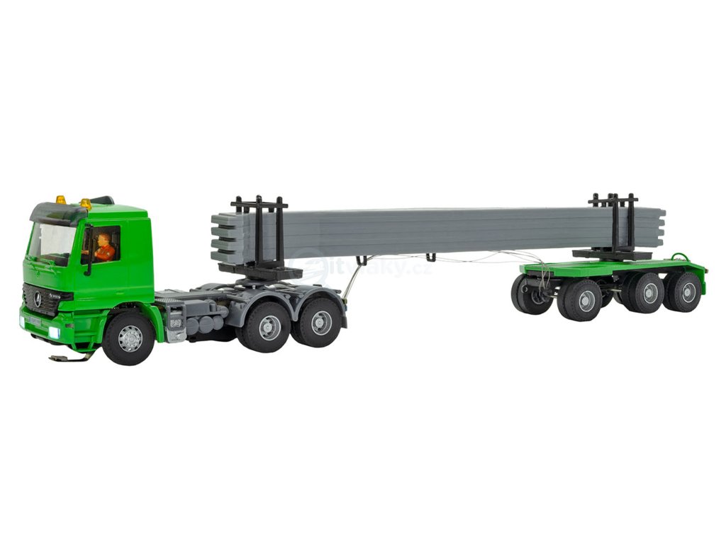 V roce 1996 představil Mercedes řadu ACTROS v různých variantách. Toto vozidlo je vybaveno kabinou M. Stejně jako všechny modely řady CarMotion je vybaven následujícími funkcemi: - Nabíjení a programování připojení - Krátká doba nabíjení díky moderním lithium-polymerovým bateriím - Při plné baterii a běžném provozu s čekacími dobami a různými rychlostmi je možná doba provozu přibližně 4 až 6 hodin a přibližně 2 hodiny při maximální rychlosti/plném zatížení. - Snadné zapínání/vypínání pomocí jazýčkového kontaktu pod střechou kabiny s magnetickou ukazovací tyčí nebo teleskopickou magnetickou tyčí, položka 8410 - Infračervený vysílač/přijímač pro dálkové ovládání (omezená kompatibilita s jinými IR systémy) - Realistické brzdění resp. zrychlování a konfigurovatelná rychlost díky motoru s regulací otáček - Volný nákladový prostor díky pohonné jednotce pod podlahou - Osvětlení kabiny - Brzdová a couvací světla - Směrová světla vpravo/vlevo a výstražná světla ovladatelná - Potkávací/dálková světla - Střešní majáky (v závislosti na typu vozidla) - Průhledná kabina řidiče s postavou - 5pólová zásuvná spojka pro připojení přívěsů nebo návěsů CarMotion - Kompatibilní se stávajícími systémy s kontaktním vodičem nebo magnetickou páskou - Ovládání infračerveným světlem (IR), permanentními magnety poz. 8431 ve vozovce, elektromagnetickými brzdovými cívkami a dálkovým ovládáním poz. 8402 - I bez mechanického vedení je možná krátká přímá jízda vzad prostřednictvím řízení dálkovým ovládáním Údaje o prototypu: DOLL 3-nápravový vozík. D 21,5 x Š 3,5 x V 3,9 cm.