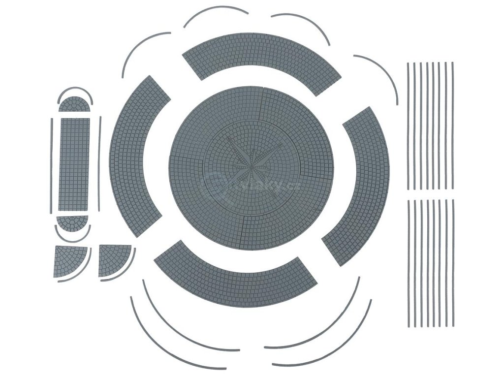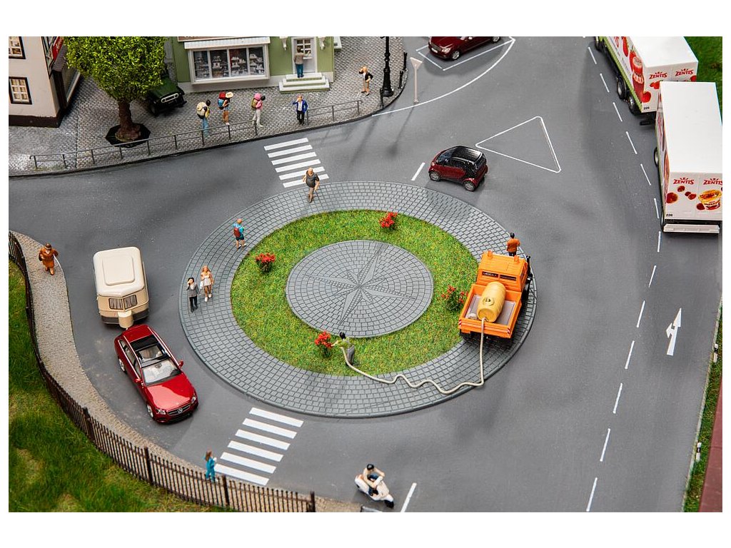Stavebnice silnic a cest se vstřikovanými malými díly pro vytvoření velkého kruhového objezdu s dopravním ostrůvkem nebo středně velkého kruhového objezdu, chodníků a dopravního ostrůvku. Gravírování na obou stranách pro stavbu s kosočtvercovým nebo jasanovým vzorem. Vhodné např. pro "sadu chodníkových desek", obj. č. 180537.