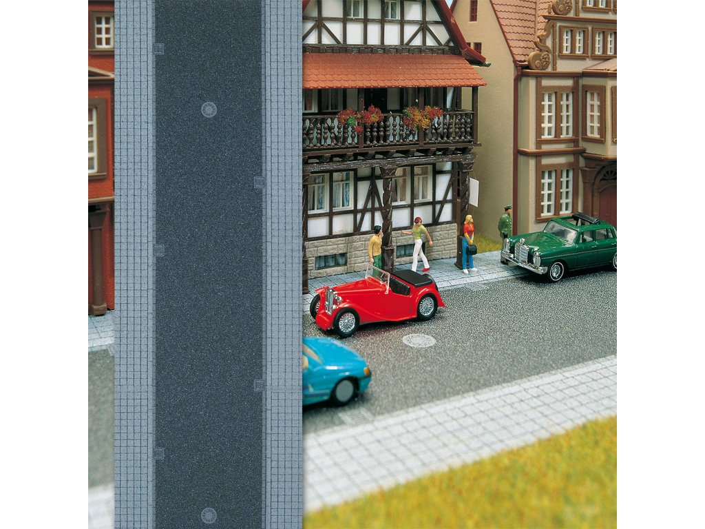 Městská ulice s chodníkem, poklopem šachty a odvodňovacími kanály, šířka 110 mm, délka 1 m.