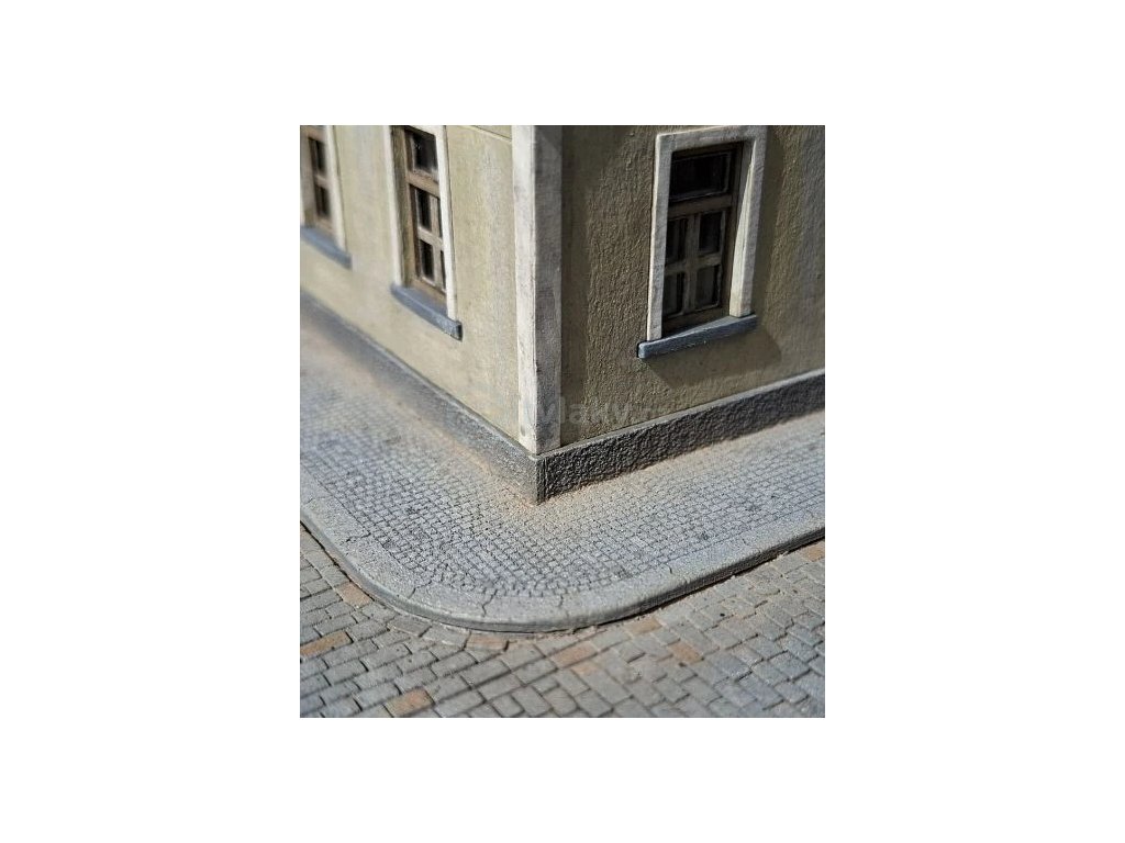 Chodníky s obrubníky v provedení malé čtvercové dlažby jsou součástí modulárního systému laserovaných kartonových silnic a chodníků Model Scene. Díky přesnému laserovému gravírování vynikají realistickým vzhledem, který se hodí pro městské i vesnické scény.