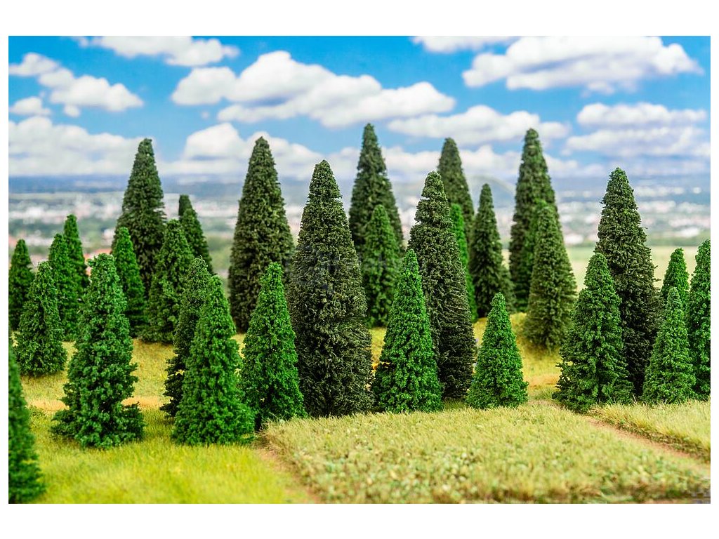 Těchto 100 jedlí se skvěle hodí k vytváření velkých lesů! Různé velikosti stromů zajišťují rozmanitost na miniaturním plánu. Každý strom má základnu. Malý profesionální tip: Pro realističtější instalaci odstraňte podstavec, vyvrtejte do rozvržení otvor a vložte jedličku s trochou lepidla.