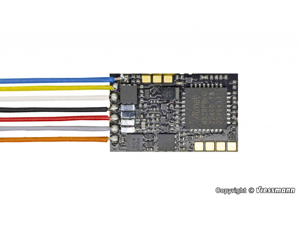 Lokomotivní dekodér pro stejnosměrný proud, NMRA-DCC (2 a 4místné adresy) a Märklin-Motorola (staré/nové) s automatickým rozpoznáváním formátů. Nastavitelné minimální, průměrné a maximální rychlosti a také volně programovatelná tabulka kroků rychlosti (28 kroků, interpolovaně pro 128 kroků rychlosti), nastavitelné vysokofrekvenční řízení zátěže, vhodné i pro zvonkové kotevní motory, se 14, 28 a 128 kroky rychlosti. Trvalý proud motoru 0,5 A, max. 0,8 A, 2 světelné výstupy závislé na směru otáčení s doplňkovými funkcemi: Funkční mapování (volně programovatelné přiřazení funkčních tlačítek), stmívání, blikání, odpojovač. Manévrovací zařízení (vypnutá akcelerační a brzdná rampa). Celková zatížitelnost funkčních výstupů je 300 mA. Všechny výstupy jsou chráněny proti přetížení a dekodér je rovněž chráněn proti přehřátí. Má rozhraní SUSI a přípojku pro ukládání energie, obojí na pájecích ploškách. S barevně označenými připojovacími vodiči. Rozměry: D cca 1,15 x Š 0,95 x V 0,21 cm.