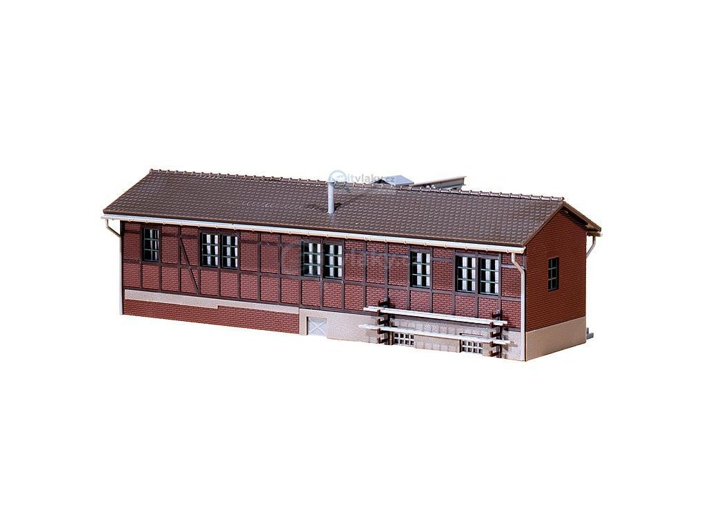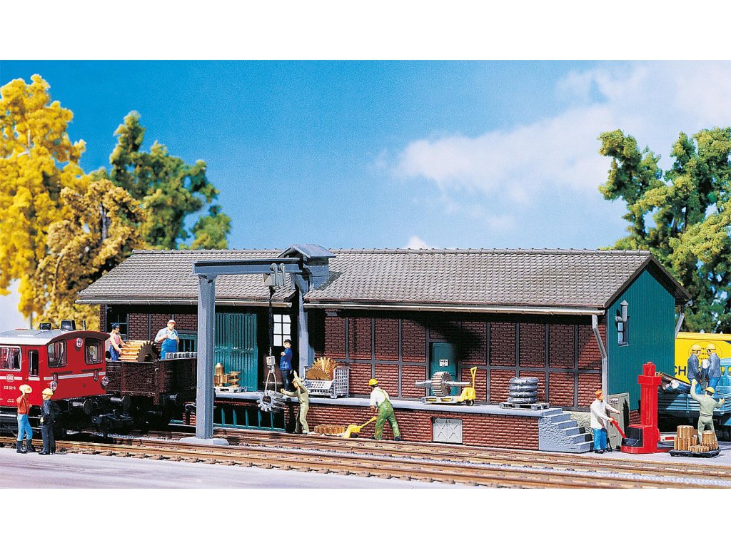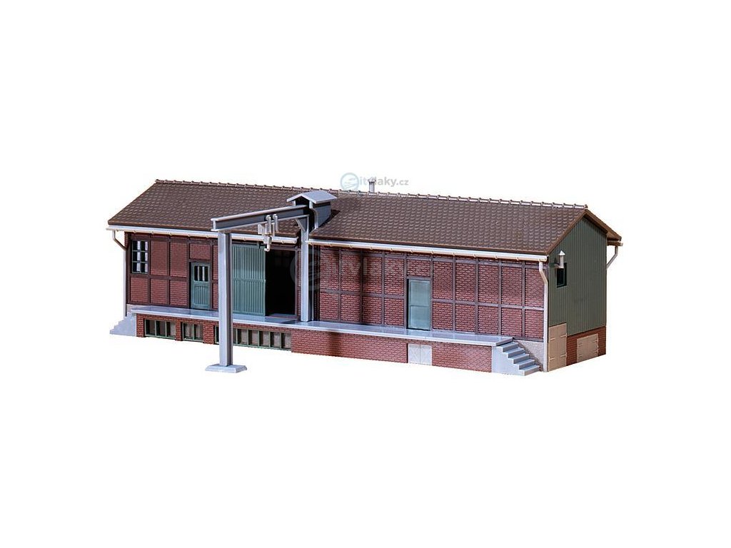 Kůlna s připojeným nakládacím jeřábem a přístřeškem. Může být použit v železniční oblasti nebo např. jako sklad BW materiálu.