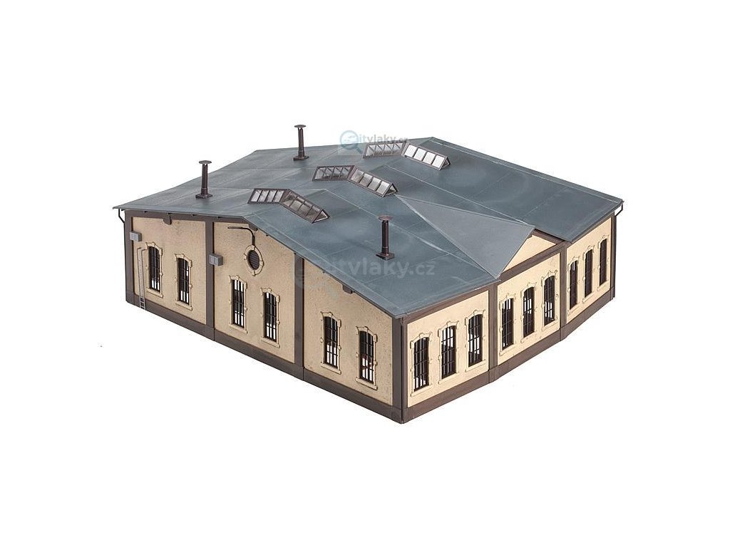 Rozšiřitelná rotunda pro lokomotivy se třemi stáními a sklonem 7,5 stupně, s jezdci na střeše a velkými bočními a zadními okny pro lokomotivy do rozchodu 290 mm ve vaší sbírce. Součástí stavebnice jsou díly servopohonu pro všechny brány a četné příslušenství, jako jsou vřetenové zvedáky, čekárna pro strojvedoucího lokomotivy a trafostanice.