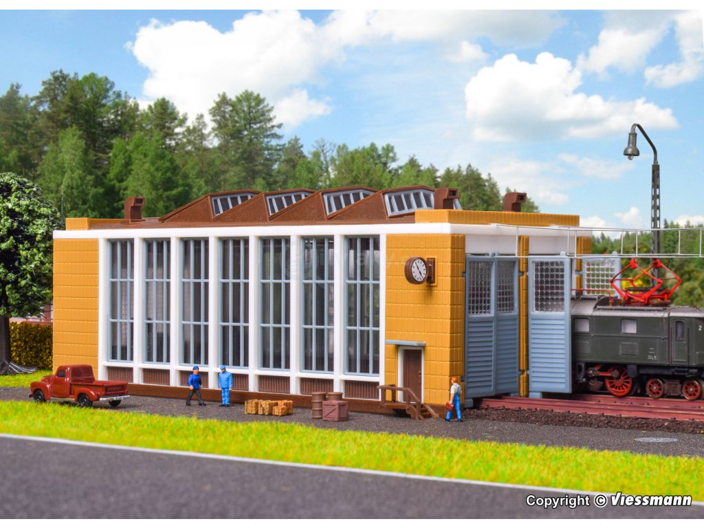 Nezáleží na tom, zda jezdíte na elektřinu nebo na naftu, moderní lokomotivní boudy musí být. Dveře se automaticky otevírají a zavírají podle přijíždějících a odjíždějících lokomotiv. Rozměry: D 15,5 x Š 8 x V 6 cm / vzdálenost os kolejí 3,1 cm.