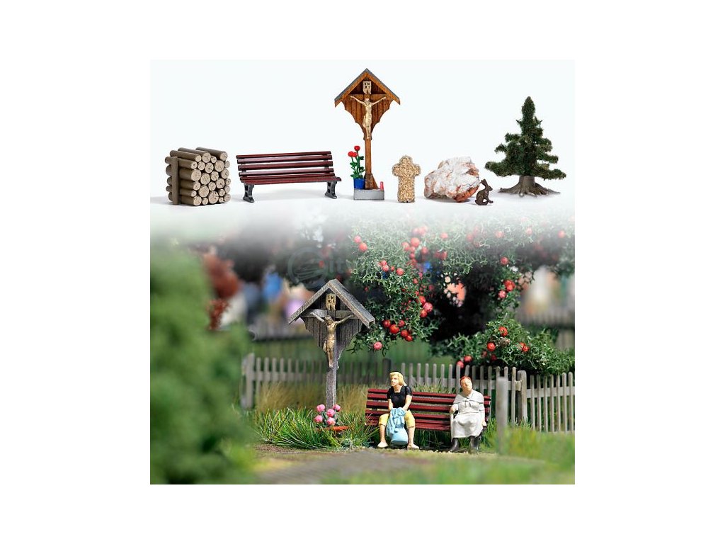 Reprodukce dřevěného kříže u cesty. Replika vyřezávané postavy Ježíše s pozlaceným povrchem (plast) je obzvláště filigránská. Kříž stojí na kamenném podstavci s květinovou výzdobou a hrobovým světlem. Hotový model. Dodávka včetně lavičky, dřevěné hromady, kamenného balvanu, kamenného kříže, zajíce a mladého smrku.