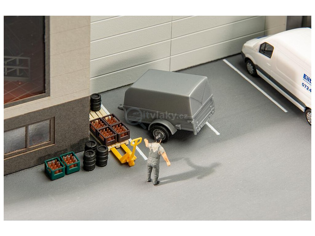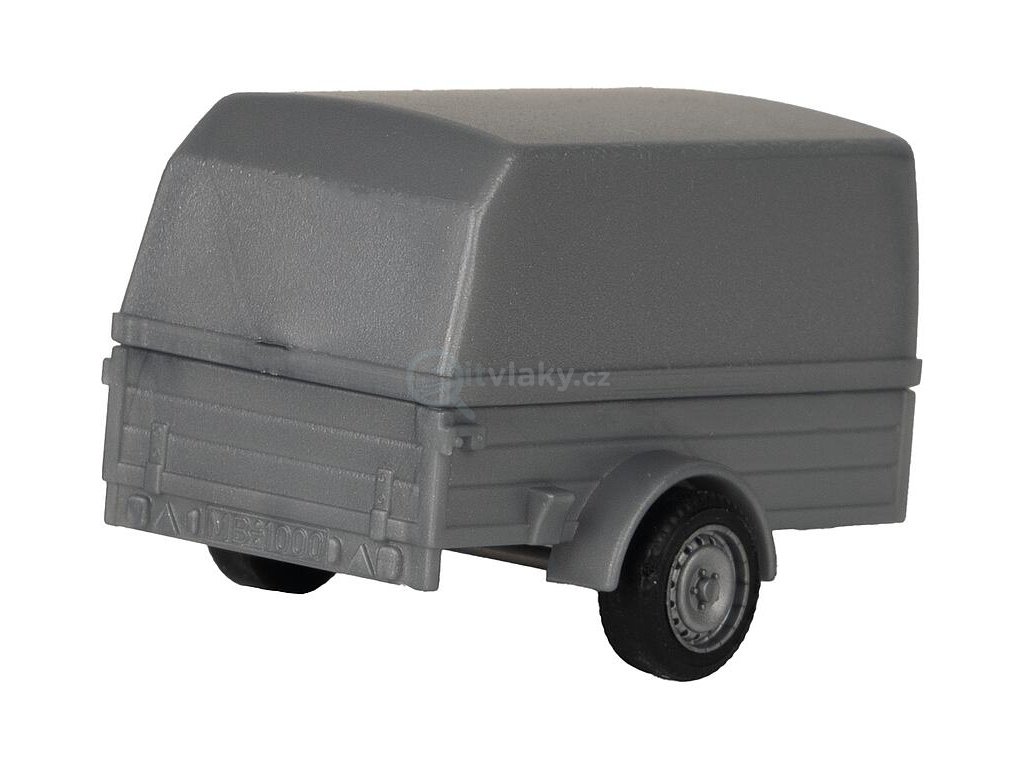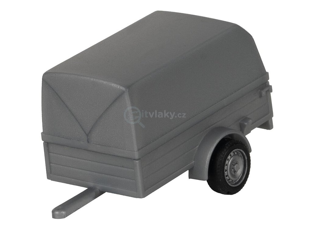 Šedý jednonápravový přívěs za auto s krycím kufrem.Perličkou jsou stavebnice zábavních parků s mnoha atrakcemi a jezdící silniční vozidla k modelové železnici.