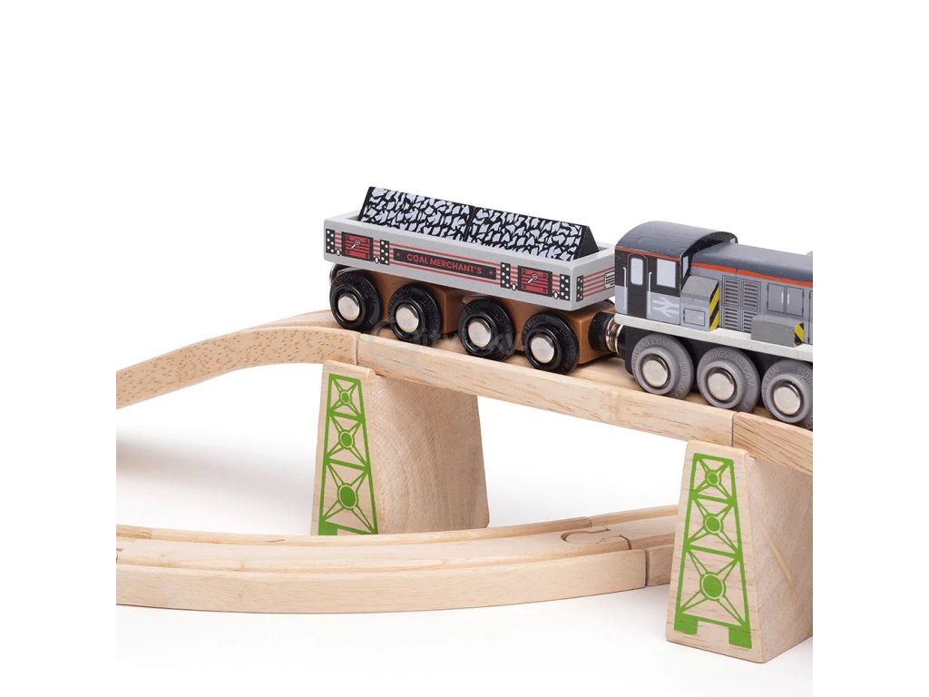 Tento dlouhý vagón na uhlí, se dvěma kusy uhlí, je skvělý doplňek k jakémukoli železničnímu systému vláčkodráh. Nemusí však vozit jen uhlí. Je jen na vašem dítěti, co si na tento vagónek naloží.