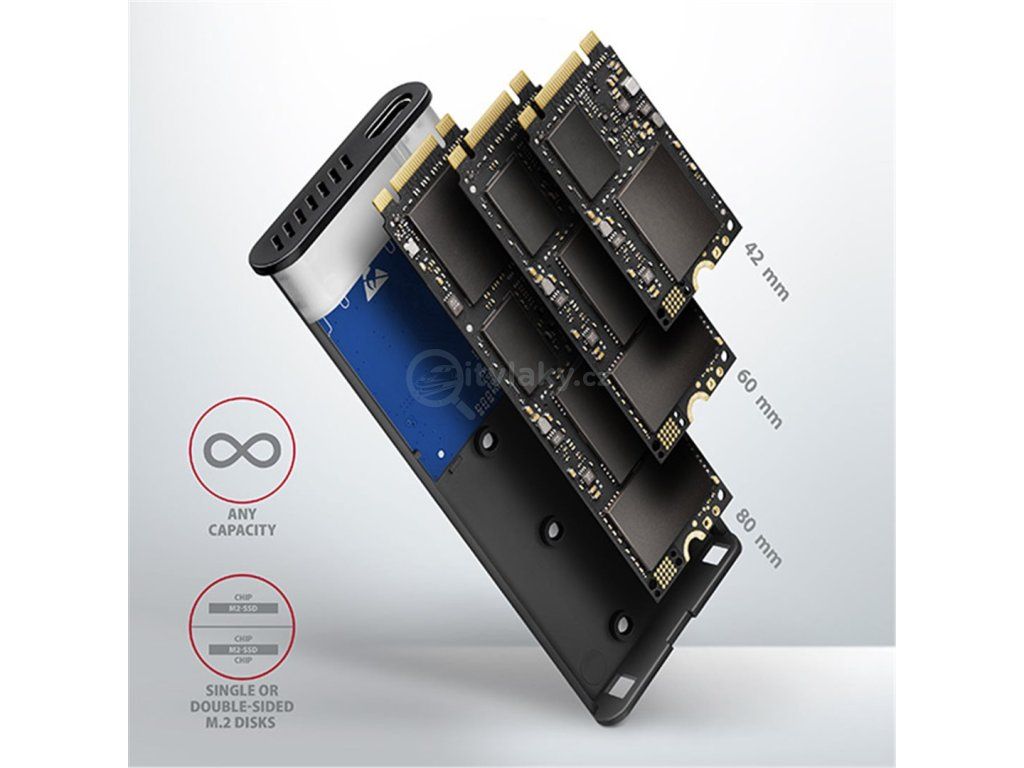 Unikátní vlastností, díky novému čipsetu, je možnost použití jak M.2 NVMe tak i SATA disků. Nemusíte tak přemýšlet jaký typ M.2 disku do boxu vložíte. Výhodou je uchycení rovnou pro tři různé délky SSD karet - 42, 60 a 80 mm. M.2 karty mohou být jednostranné nebo oboustranné. Box nemá omezení kapacity vloženého SSD disku.