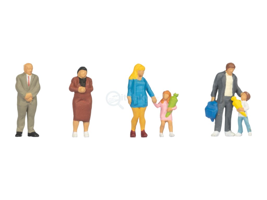 Detailní sada figurek „První školní den“ v měřítku H0. Děti s aktovkami a dospělí v doprovodu pro civilní scény.