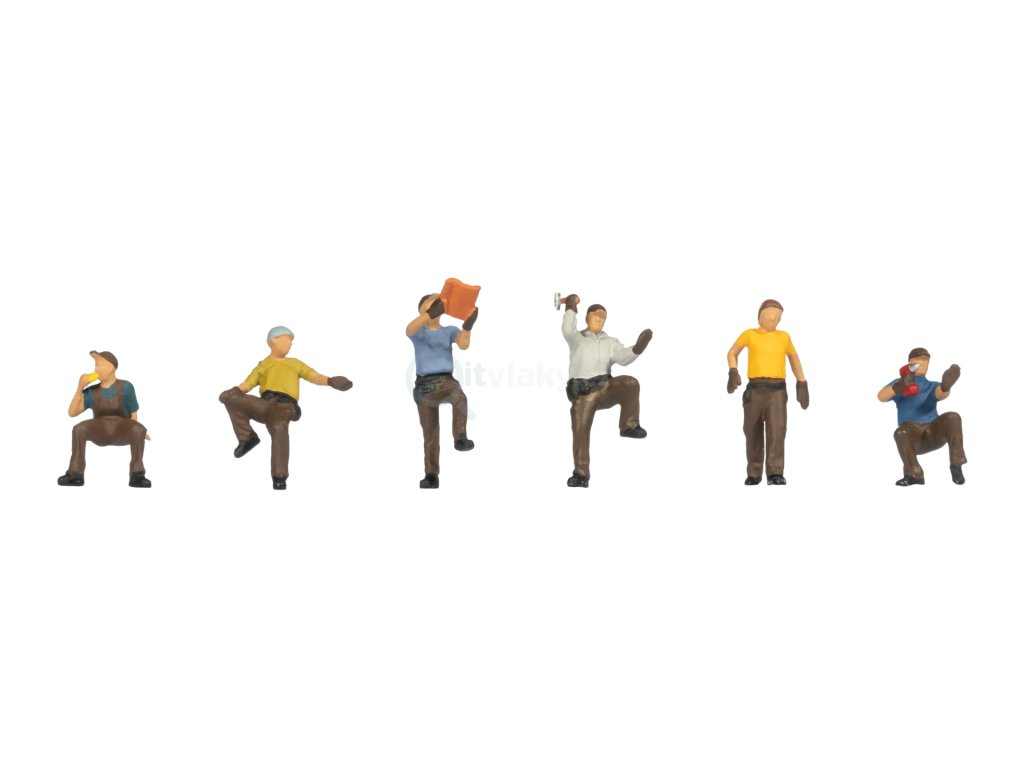 Detailní sada figurek „Pokrývači“ v měřítku H0. Postavy řemeslníků s nářadím vhodné pro stavební scény na kolejišti.