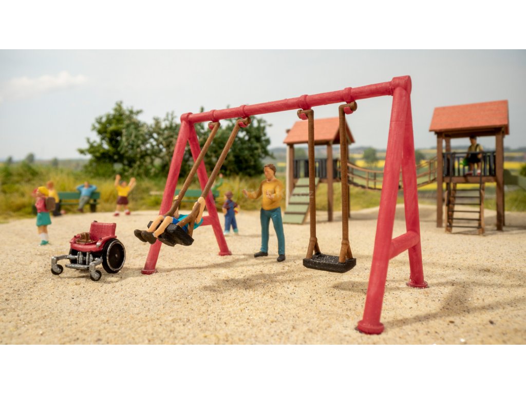 Téměř každý z nás by měl mít na dětská hřiště a jednotlivé herní prvky hezké vzpomínky z dětství. Houpačka, kde na nás rodiče celé hodiny zírali; dětský kolotoč, ze kterého se nám vždy zatočila hlava, nebo houpačka, kterou bylo tak těžké vyvážit. Hřiště najdeme v každém městě a vesnici a jsou tedy důležitou součástí lidského soužití. Rodiny se setkávají, děti si hrají a smějí se, rodiče si povídají o práci a vzdělání a někteří si vyměňují nejnovější drby, zatímco se potomci pokojně houpají. Po velkém úspěchu „stromu s houpačkou“ v loňském roce jsme se pustili do vývoje čtyř pohyblivých dětských hřišť: dětská houpačka, klasická houpačka, houpačka ptačí hnízdo a dětský kolotoč. Ručně malované herní vybavení a modely figurek jsou plně sestavené. Každé zařízení je poháněno motorem umístěným přímo pod modelem (instalační hloubka 35 mm). Mechanismus pro pohon je dodáván jako stavebnice. Rychlost lze nastavit na desce plošných spojů. Dodávaná elektronika je připojena ke standardnímu 16V transformátoru modelové železnice a je vhodná pro stejnosměrný i střídavý proud.