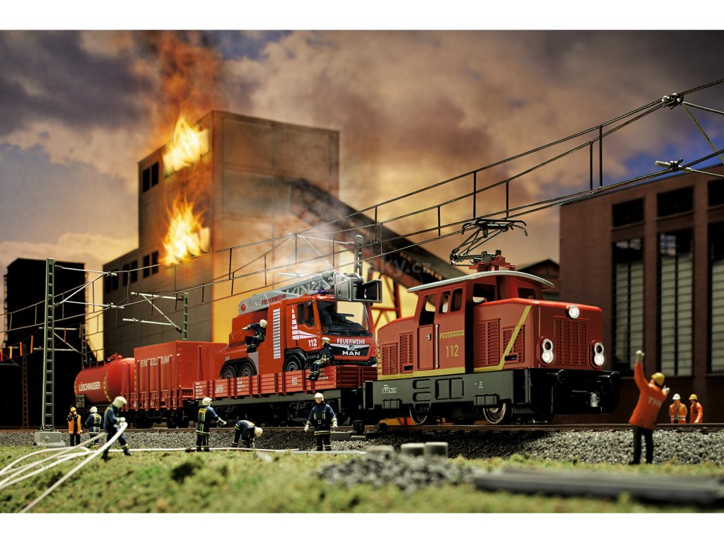 Fiktivní hasičská lokomotiva na bázi elektrické lokomotivy Henschel typu EA 500. Nízký postranní vůz pro přepravu hasičského žebříkového náklaďáku, kůlový vůz s velitelským stanovištěm a cisternový vůz Hasicí voda natřený a označený pro DB Emergency Group.