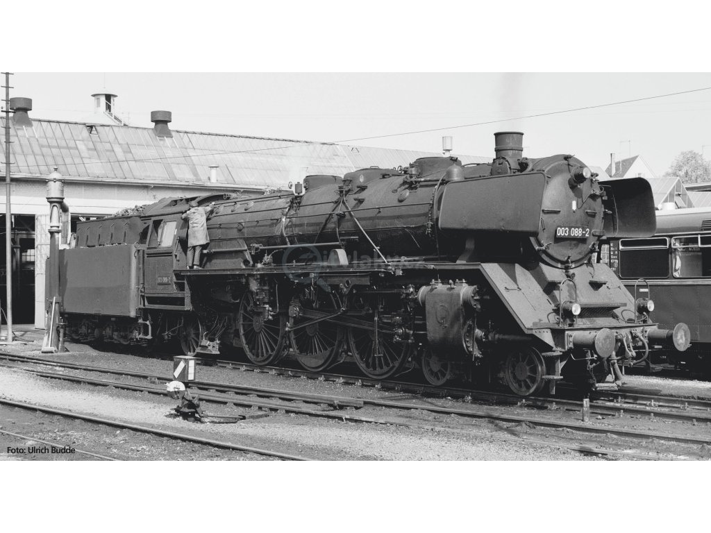Novinka 2023: Pro provoz na tratích s maximálním zatížením dvojkolí 18 t bylo v letech 1930-1938 pro Německé říšské dráhy vyrobeno celkem 298 standardních rychlíkových lokomotiv třídy 03. Konstrukce vycházela z třídy 01, jejíž pojezdová hmotnost dvojkolí byla více než 20 t. Pro snížení celkové hmotnosti měla třída 03 lehčí ingotový rám a menší kotel a válec. Zatímco prvních 122 strojů bylo původně schváleno pro maximální rychlost 120 km/h, u pozdějších jednotek po ukončení prací to bylo 130 km/h. V roce 1959 tvořilo vozový park DB celkem 145 lokomotiv třídy 03. O devět let později se jejich počet snížil na 45 lokomotiv, které jsou nyní známé jako třída 003. Poslední tři z nich byly nakonec dodány v roce 1972.Arthur Honegger kdysi věnoval elegantním parním lokomotivám Pacific hudební skladbu. S modelem 03 se takový stroj dostává do sortimentu PIKO. Siluetu stroje v modelu charakterizuje také vysoký štíhlý kotel a vzdušný tyčový rám s průhledem. Filigránský podvozek s jemnými paprsky a velmi plastickými vyvažovacími závažími působí obzvlášť půvabně. Nová konstrukce má odpovídající přídavné díly, jako jsou zvonky, čerpadla a lampy. Vnější dojem dotvářejí četné připojené kotlové trubky. Pohon včetně setrvačníku umístěného v nabídce zajišťuje ideální jízdní vlastnosti. Tovární digitální verze modelu mají přepínatelné osvětlení motoru a kabiny strojvedoucího a také červeně blikající topeniště. Tyto funkce a různé zvuky lze ovládat pomocí zvukového dekodéru PIKO integrovaného z výroby. Zvuková verze má také integrovaný parní generátor už z výroby.