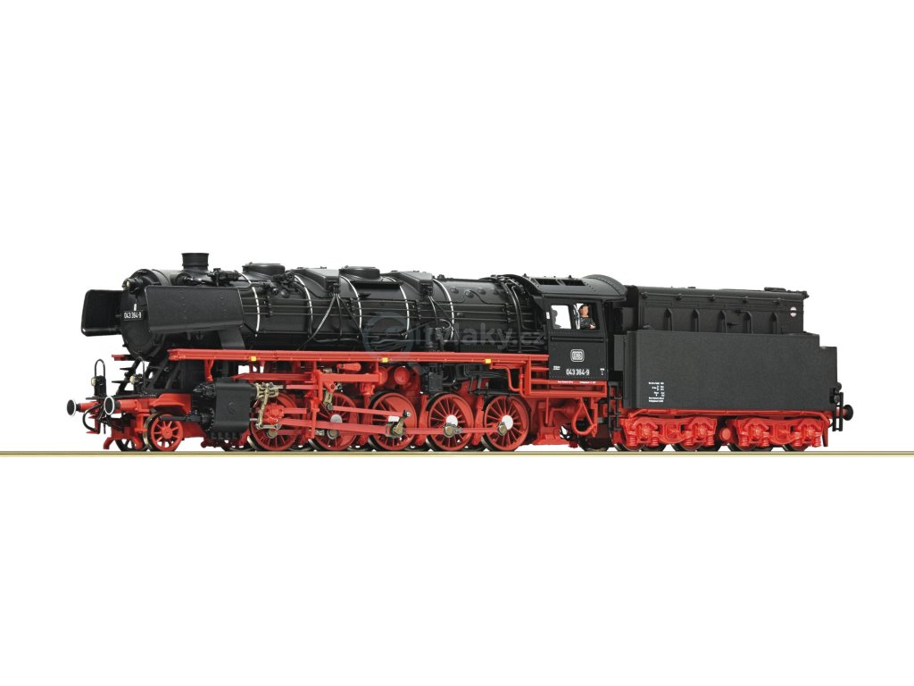 Steam locomotive class 043, DBDampflokomotive Baureihe 043 der Deutschen Bundesbahn. Antrieb auf zwei Achsen des Tenders und über Kardanwelle auf alle fünf Treibachsen der Lok. ■ Mit handgemalten Kesselzierringen ■ Einsatz im schweren Güterzugdienst ■ Metallräder mit filigranen Speichen Die wegen ihrer Zugkraft als „Jumbo“ bezeichneten Dampfloks waren in fast ganz Deutschland sowie in vielen anderen europäischen Staaten mit großem Erfolg eingesetzt. Die Höchstgeschwindigkeit lag vorwärts bei 80 km/h, rückwärts konnte mit 50 km/h gefahren werden. Einige dieser ohnehin schon sehr zugkräftigen Maschinen verzeichneten bei der Deutschen Bundesbahn noch eine weitere Leistungssteigerung auf 2.100 PS (1.546 kW), als sie ab 1955 auf Ölfeuerung umgebaut wurden. Die ölgefeuerten Lokomotiven der DB führten ab 1968 die Baureihenbezeichnung 043.