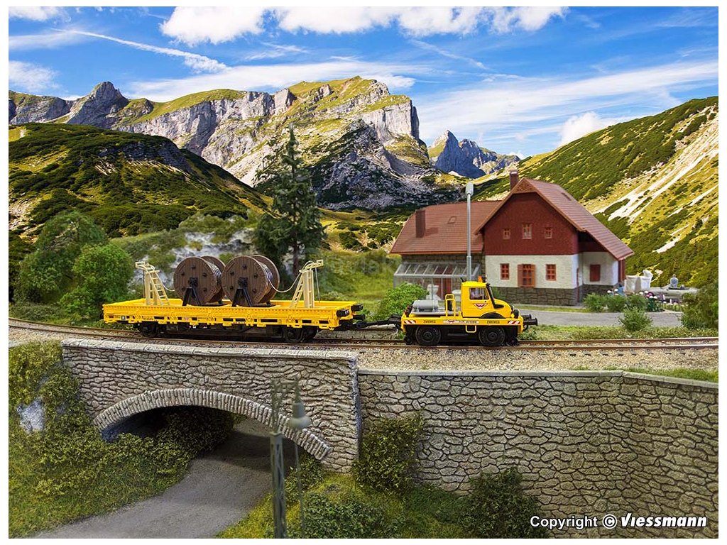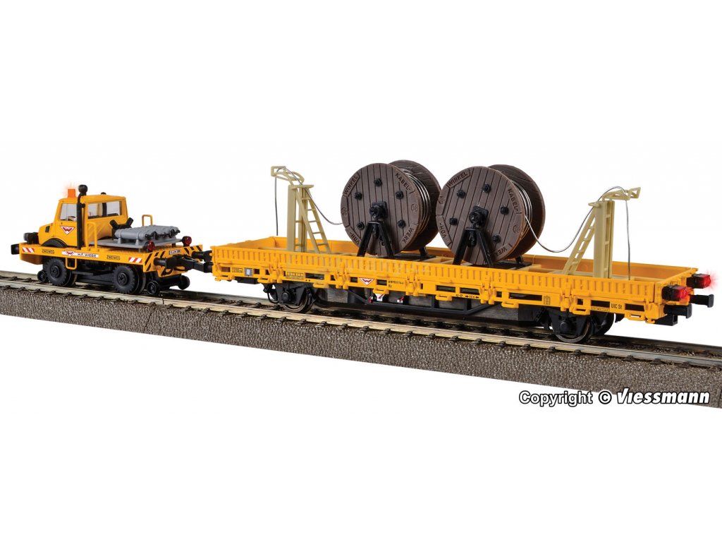 H0 - silniční a železniční vozidlo UNIMOG s tlačným rámem a přívěsem pro údržbu trolejového vedení, funkční model