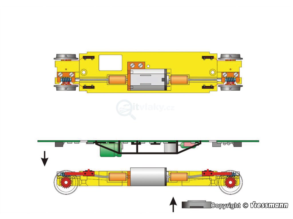 Pohon v podlaze vozu, lze využít i s jiným tlačeným vozidlem. Digitální dekodér : DCC a Motorola / Délka přes nárazníky : 230 mm
