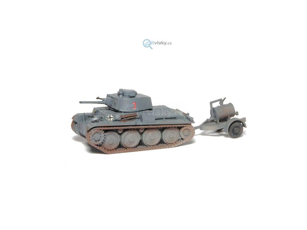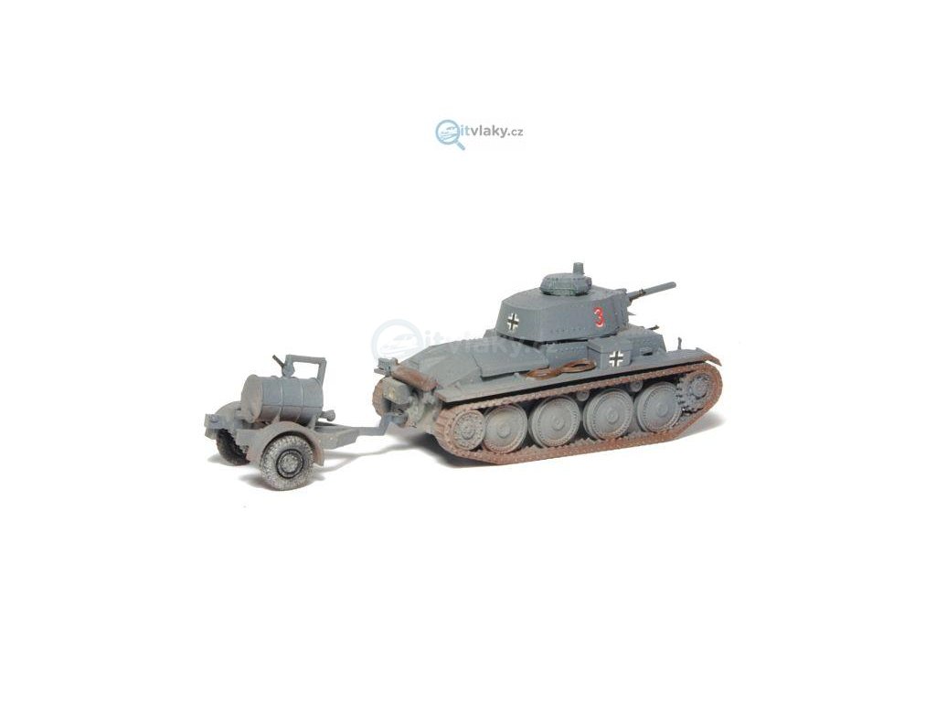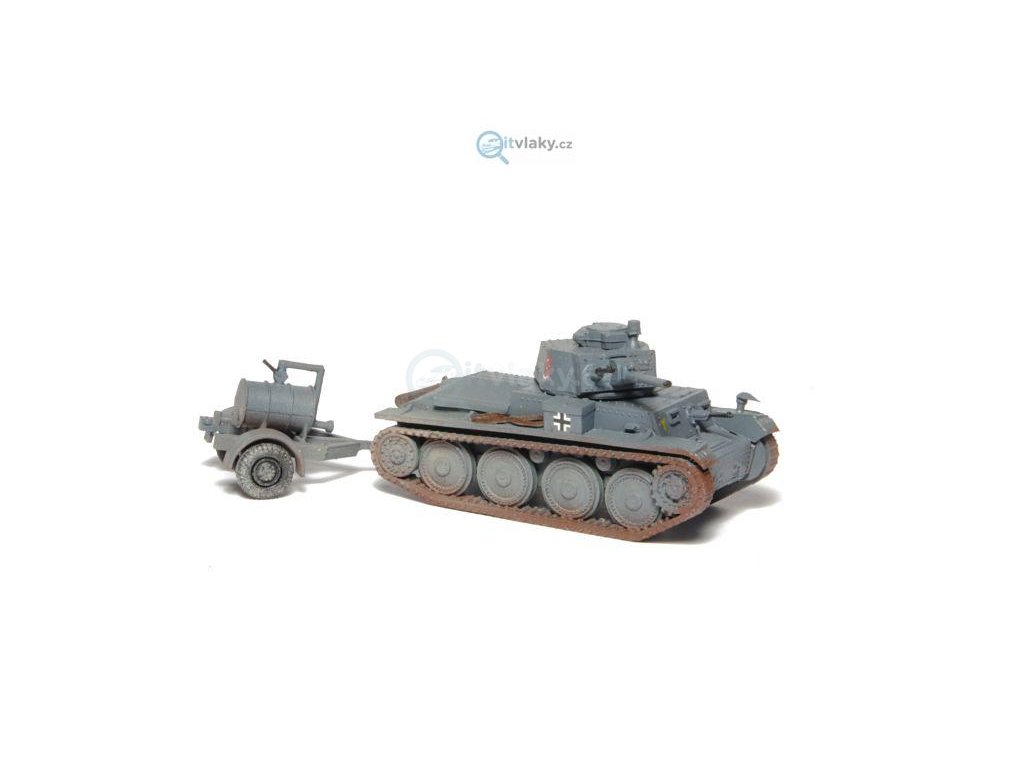 Kompletní plastiková stavebnice lehkého tanku s cisternovým vlekem. Obsahuje probarvené plastikové výlisky na sestavení modelu tanku a vleku a sadu obtisků