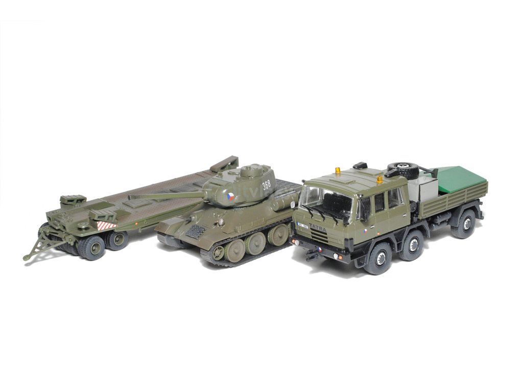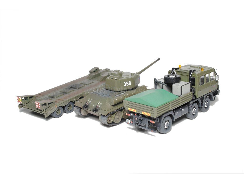 Kompletní plastiková stavebnice Tatry 815 6×6 TP, podvalníku P-50 a tanku T-35/85 vz. 53cs. Obsahuje probarvené plastikové výlisky na sestavení modelů, kovové osičky a sadu obtisků.