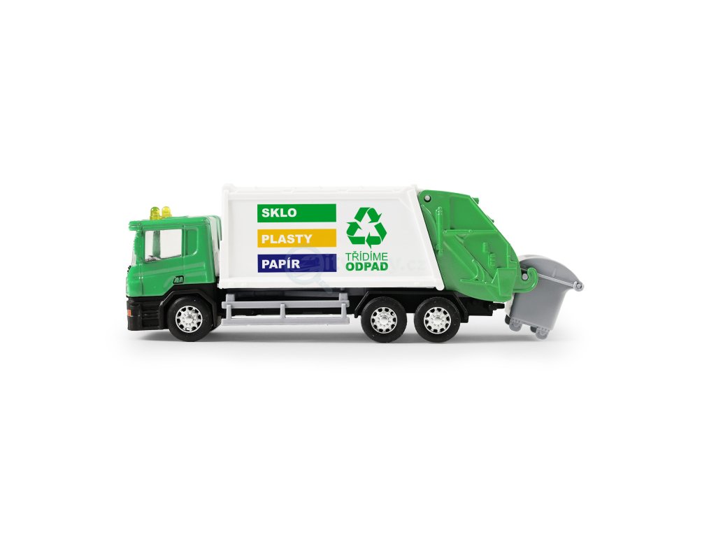 Kovové popelářské auto s plastovou korbou. Korba má v zadní části odklápěcí dveře, součástí je otevírací kontejner. Auto jezdí na zpětný chod a jeho délka je 15 cm.