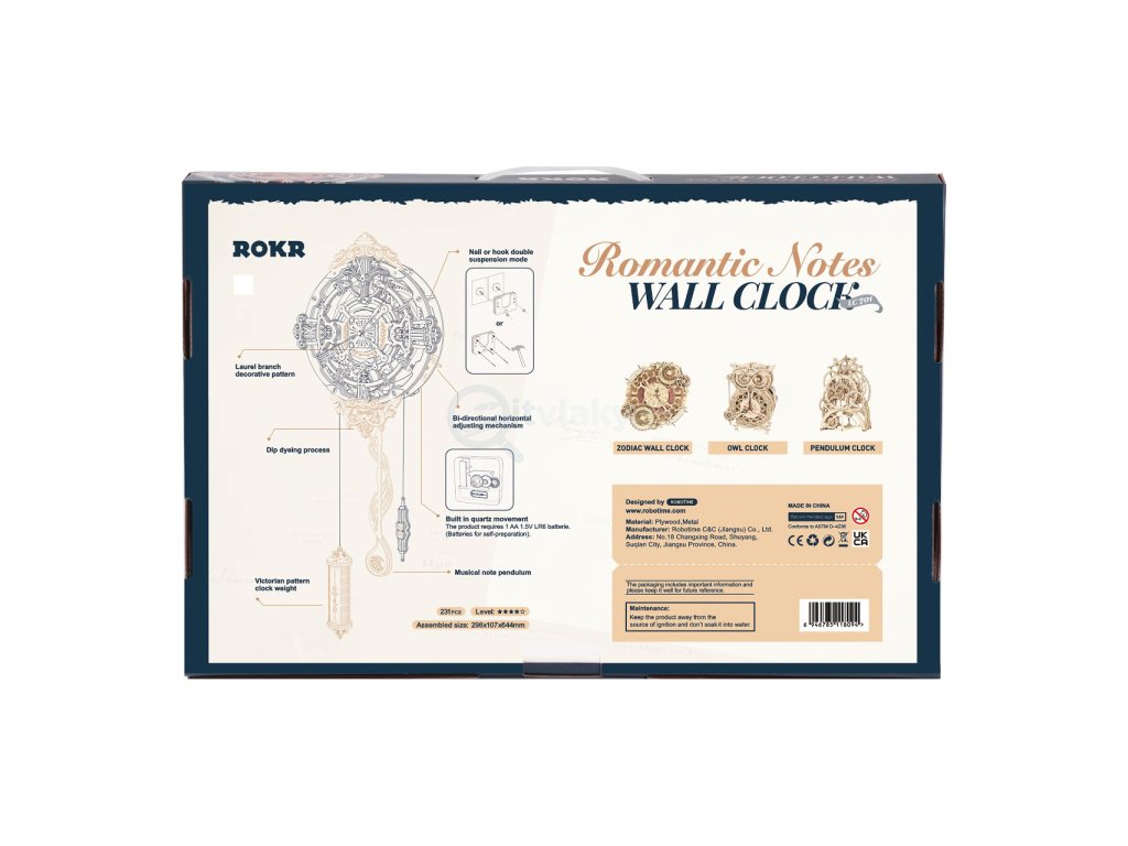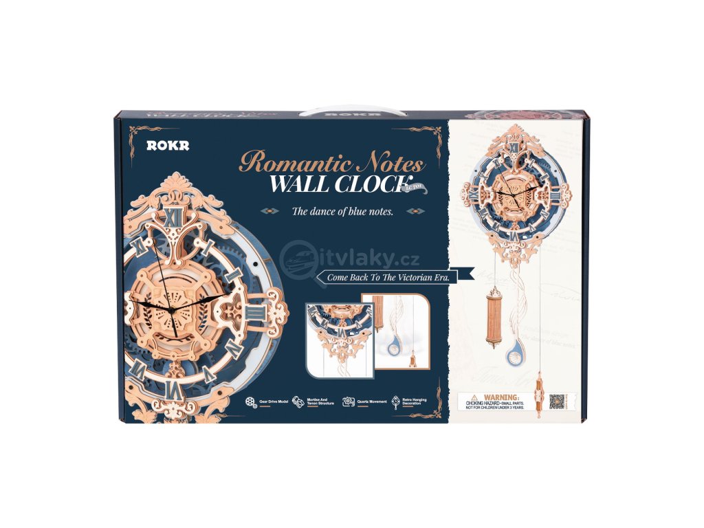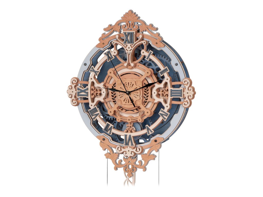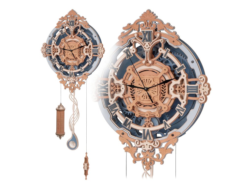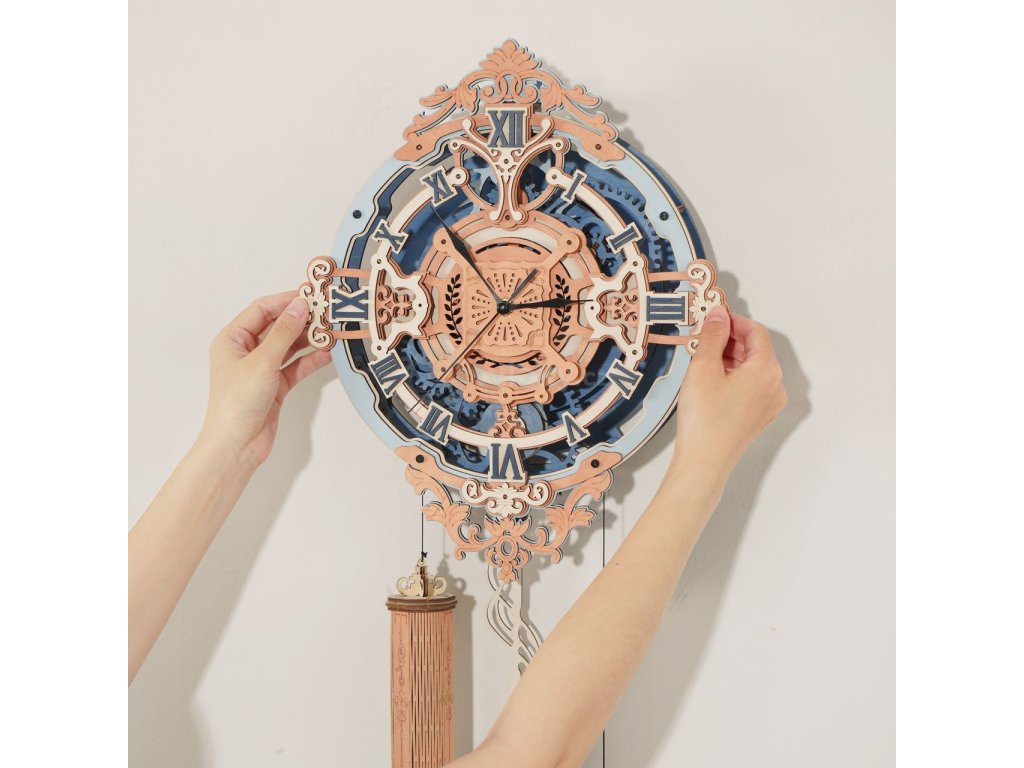 Skládačka nástěnných hodin nabízí hned dvojitou porci zábavy a relaxace. Uvolněte se při sestavování rozměrného ciferníku podrobně zdobeného ornamenty a funkčního krokového mechanismu. Hotové hodiny Vás pak budou moci těšit uklidňujícím tikotem a kmitavým pohybem kyvadla. Pečlivě zvolené barevné schéma kombinující odstíny přírodního dřeva s modrou a oranžovou barvou z nich udělá nepřehlédnutelnou ozdobu Vašeho pokoje.