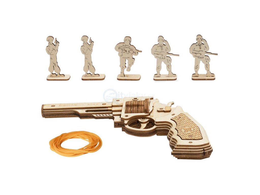 Třeste se zločinci! Stavebnice revolveru z překližky. Ihned zaujme detailním provedním a možností střílet přibalenými gumičkami na figurky, které jsou součástí stavebnice, a to až do vzdálenosti pěti metrů. Okouzlí všechny malé ochránce spravedlnosti. Skládačka je dodávána v nesloženém stavu, balena v krabici. Vybaveno detailním návodem k sestavení.