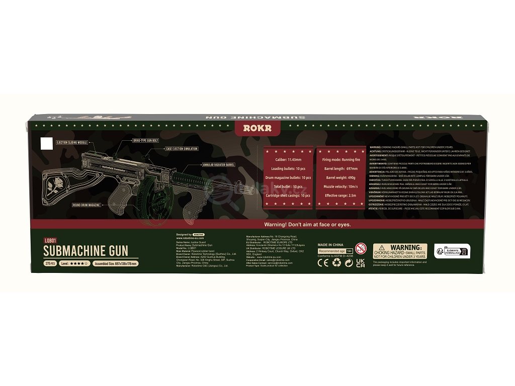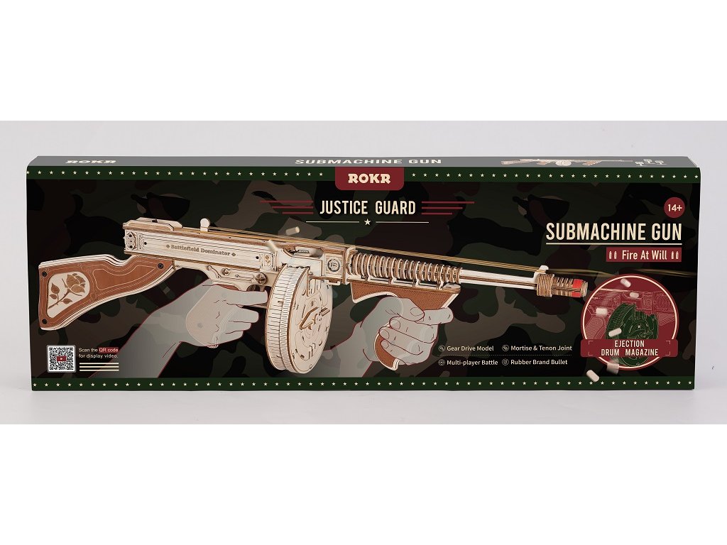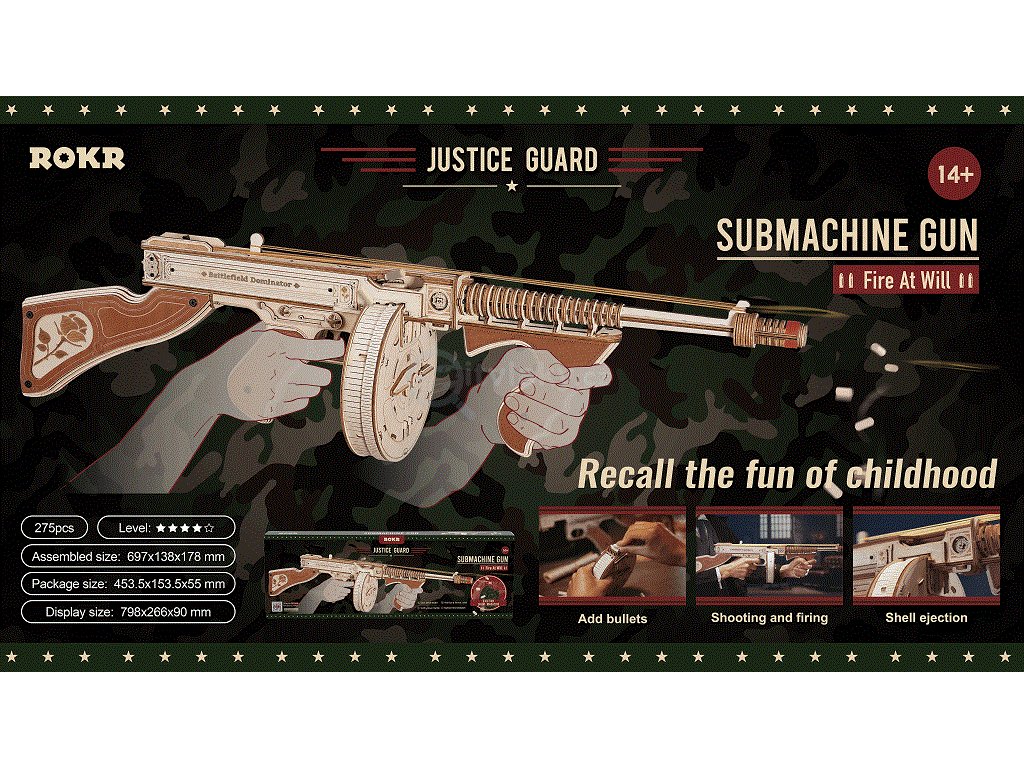 Co kdybychom vám řekli, že tento model samopalu má dva režimy střelby a ve skutečnosti můžete střílet gumičky? Tento model je nejen esteticky atraktivní, ale také funkční! Navíc, díky jeho preciznímu laserovému řezání je každý kus dokonale vystižený a připravený k sestavení. Tahle hračka je nejen skvělá pro děti starší 14 let, ale i pro dospělé, kteří mají rádi výzvy a chtějí si užít několik hodin koncentrované zábavy. Po dokončení této zábavné stavěcí výzvy budete mít u sebe doma skutečný sběratelský kousek. Představte si, jak tento úžasný samopal vystavujete na polici a všichni, kdo ho uvidí, budou z něj nadšení. Zároveň může sloužit jako funkční hračka.