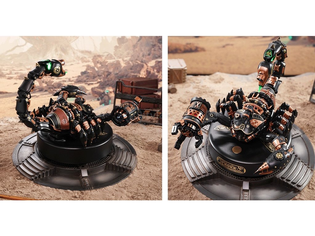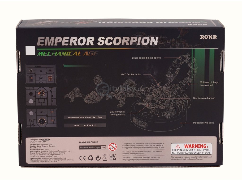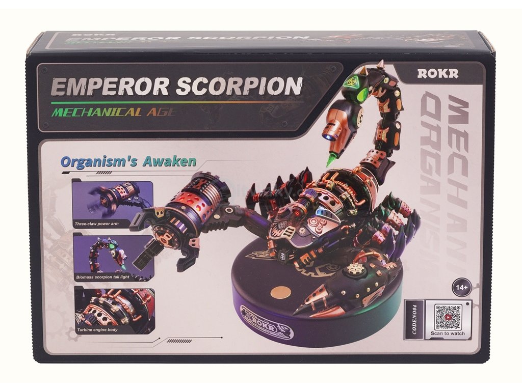 Jakmile je vypuštěný, Císař Scorpion je nepřekonatelný. Jeho vysoce mechanizovaná transformace způsobí, že se vaši nepřátelé budou třást strachem. Jeho pravá klešť se vyvinula do třídrápového uchopovacího ramene se silným jádrem, které mu umožňuje využívat různé režimy rotace k roztrhání nepřátel. Jeho tyčící se ocas je vybavený ostrými hroty a září modrým světlem, což umožňuje bodat s úžasnou přesností, zatímco zelené světlo označuje smrtící neurotoxiny ocasu, které mohou zabít s jedním zásahem. Nechte se pohltit tímto fascinujícím projektem, který potěší jak vaši mysl, tak vaše ruce. Sestavte svého vlastního císaře Scorpiona a poznejte adrenalin, který přináší bitva. Nekompromisní, kreativní a vysoce originální – RoboTime 3D mechanické puzzle modelu Císař Scorpion bude okrasou vašeho obývacího pokoje, nebo jako dárek pro všechny dospívající a dospělé nadšence fascinující hmyzí říše a robotických modelů. Vyrobeno z bezpečného, netoxického a ekologicky šetrného materiálu.