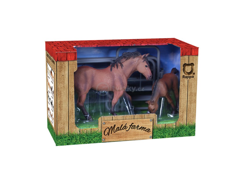 Figurka koně a hříběte v hnědé barvě. Součástí balení také ohrada. Ideální pro milovníky koní. Tato hračka je součástí kolekce Moje malá farma.