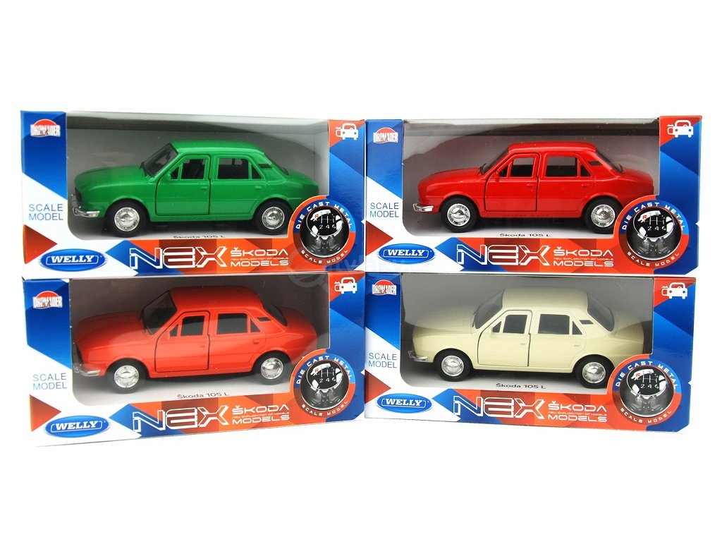 Detailní model vozu Škoda 105 L je vyroben z kovu a plastu a má otevíratelné dveře. Konkrétní barvu si můžete zvolit z nabízených možností. Obrázek produktu nemusí vždy zachycovat barevné provedení příslušné popisu. Dodáváno v různobarevné papírové krabičce s plastovým průhledem.