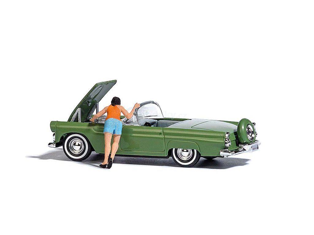 Akční sada pro realistické oživení vašeho modelového světa. Kabriolet Ford Thunderbird z 50. let s otevřenou kapotou a replikou motoru. S figurkou.