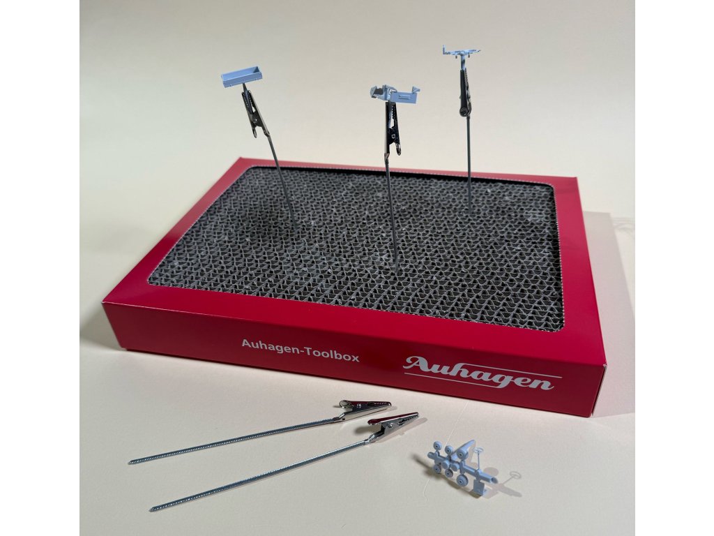 Auhagen Toolbox je praktická pomůcka pro barvení, patinování a lakování drobných dílů bez nutnosti držet je v ruce. Obsahuje voštinovou podložku a pět krokodýlích svorek upevněných na tyčkách, které umožňují pohodlné uchycení a manipulaci s jednotlivými díly. Perforovaný povrch krabice lze snadno otevřít a ihned používat jako pracovní základnu. Toolbox je ideální také pro bezpečné a čisté sušení čerstvě ošetřených dílů.