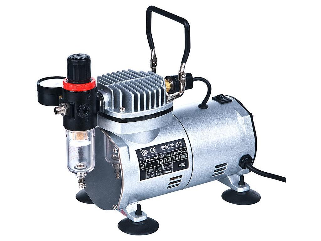 Bezolejový jednoválcový pístový kompresor se vzduchovým filtrem, nastavitelný tlak 0 - 4 bar pro nepřetržitou práci. Tepelně chráněné zařízení má funkci automatického spuštění při tlaku 3 bar (43 PSI) a funkci zastavení při tlaku 4 bar (57 PSI). Kompresor je vhodný pro airbrush pistole s velikostí trysky od 0,2 do 1,0 mm. Údaje o zařízení: Průtok vzduchu: 20 - 23 l/min Rozměry: 245 x 135 x 170 mm Hmotnost: 3,9 kg Připojení: 1/8 palce
