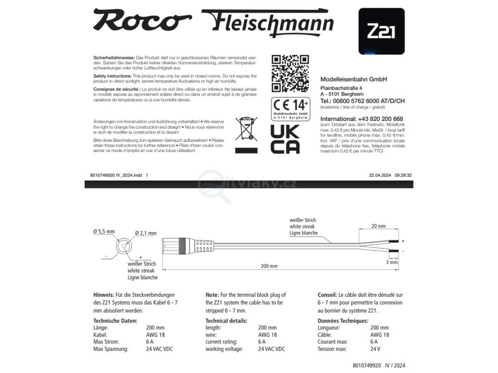 konektor 5,5 /2,1 mm pro napájení s káblíkem 20 cm / ROCO 10749
