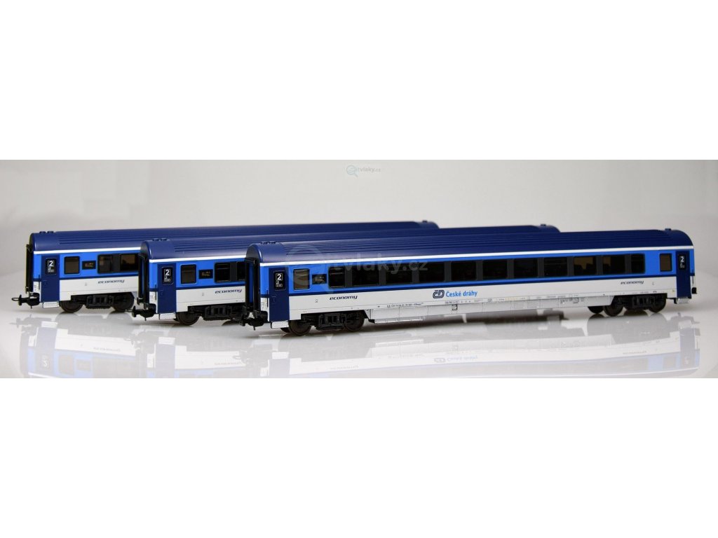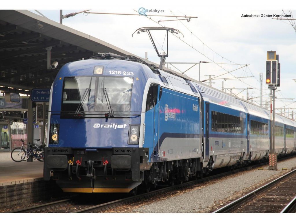 Die Tschechischen Staatsbahnen und die ÖBB betreiben im Gemeinschaftsverkehr mit Railjet Wendezügen die Strecke Graz-Wien-Prag. Set mit großem Oval und Ausweichgleis, Fahrregler und Netzteil.
