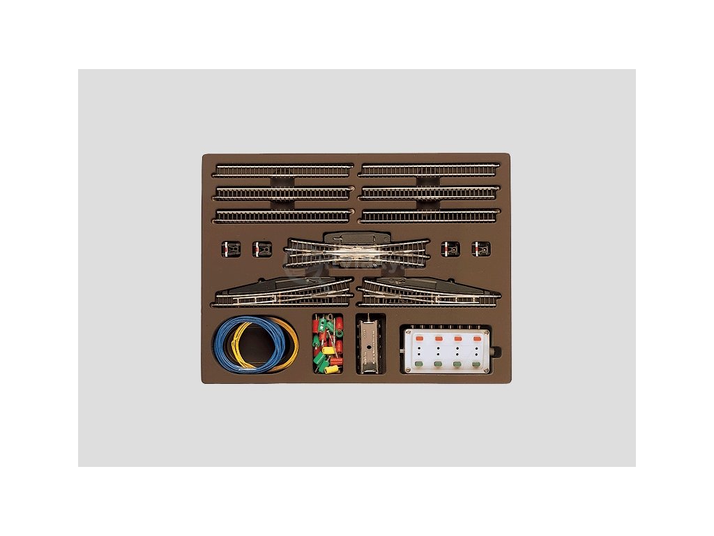 10 přímých kolejí, 1 dvojitá skluzová výhybka, 2 elektrické výhybky, 4 kolejové nárazníky, ovládací skříňka, rozvodná lišta, dráty, zástrčky a zásuvky a návod.