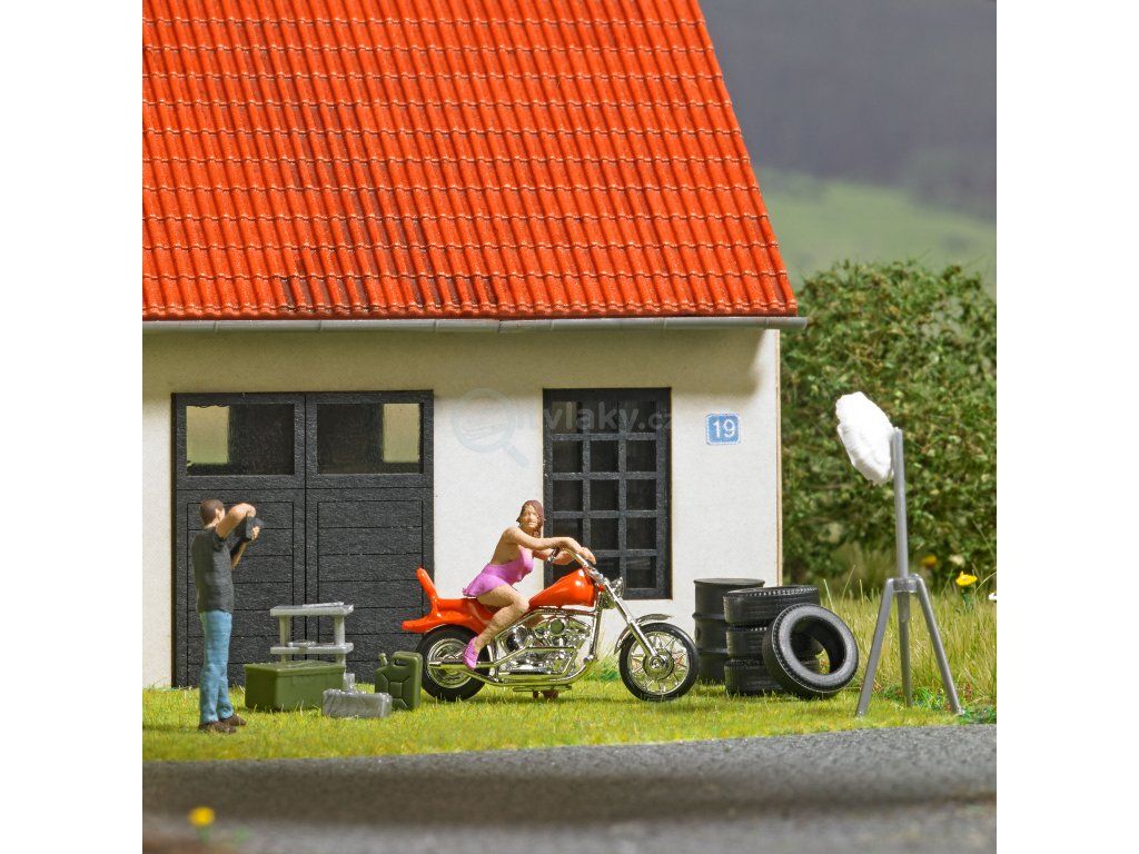 Chopper se "sexy motorkářkou" a příslušenstvím: skříňkou na nářadí, vozíkem na nářadí, kanystrem, pneumatikami a sudem na olej. Vhodné také pro focení, odpovídajícím fotografům: 79810.
