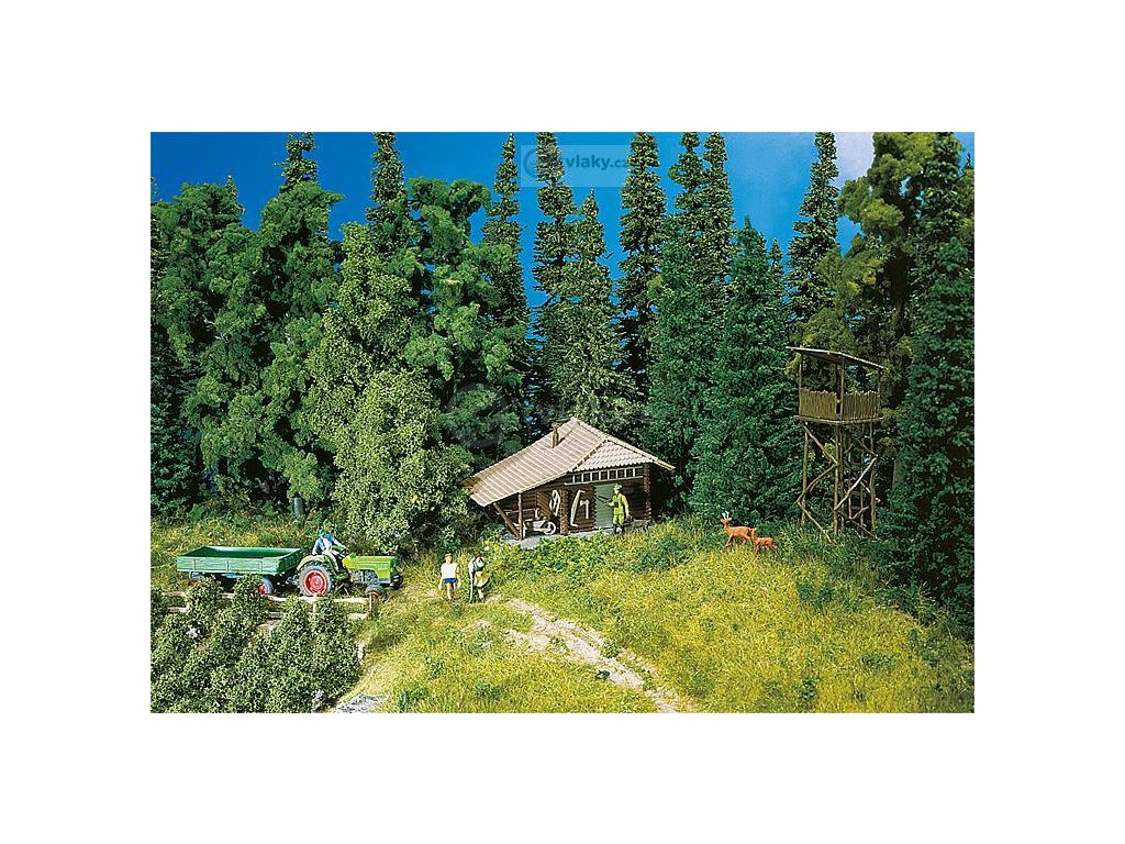 Srub se sekerou, pilou a trakařem, který by se rozhodně měl postavit v lese.