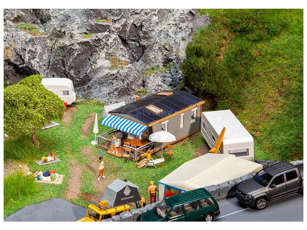 Mobilní dům. Přenosná obytná jednotka s verandou, markýzou a sedlovou střechou se střešními okny pro vytvoření kempové scény. Součástí modelu je odpovídající příslušenství, jako jsou slunečníky, lehátka a stůl se zahradními židlemi.