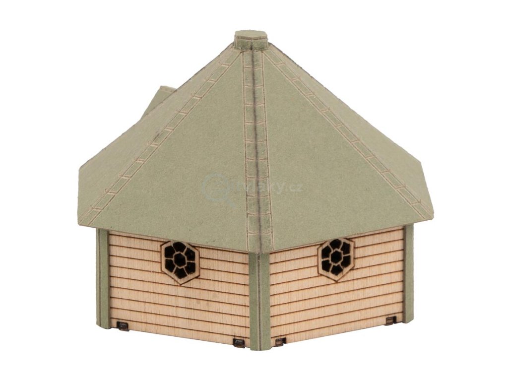 Laserem vyřezávaný model šestihranné saunové boudy s okny a kuželovou střechou.