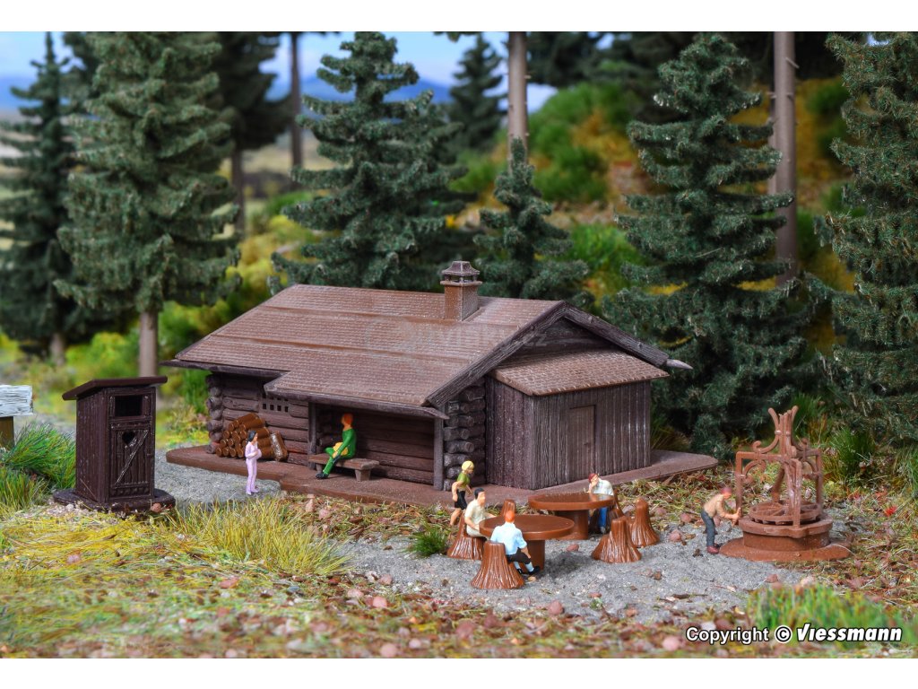 S dřevěnými stoly, lavicemi, grilem a švestkovým WC. Rozměry: D 8,3 x Š 6,5 x V 3,5 cm.