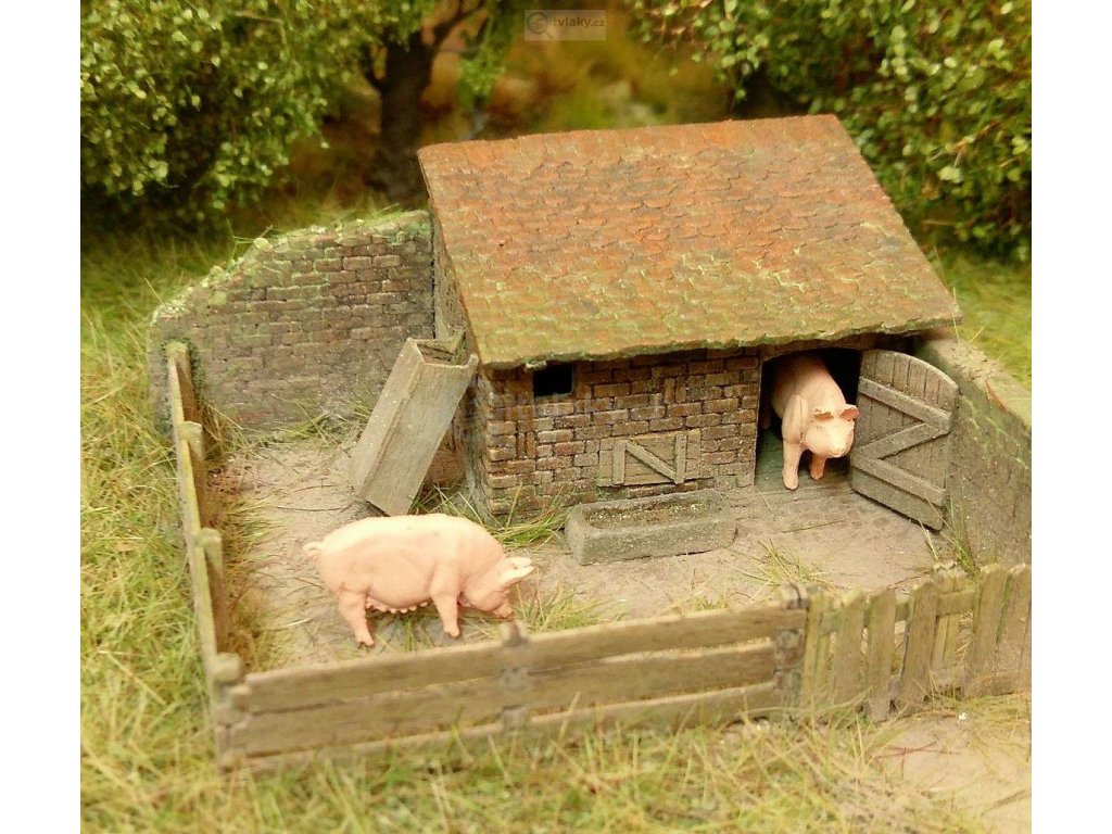 Malá stavba zděného prasečího chlívku doplněná o další drobné doplňky v podobě necek, žlabu, ale i dřevěné ohrady. Vhdoné jako doplněk k venkovským stavbám.