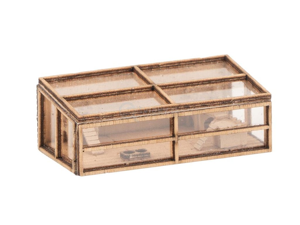 Venkovní ohrada na hraní. Laserem vyřezávaný model stáje pro malá zvířata ze dřeva se zastřešením a odpovídajícím vnitřním vybavením pro zvířata, jako jsou rampy a úkrytové zóny.