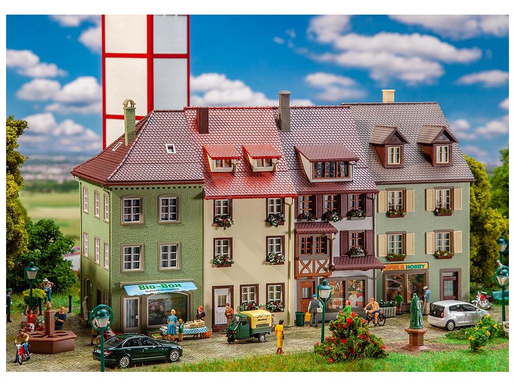 Pro vaši řadu malých městských domů! Třídílná stavební sada sestávající ze dvou okapových domků a jednoho řadového koncového domku v různých barevných provedeních. Třípodlažní modely jsou vybaveny různě řešenými fasádami, obchody v přízemí a valbovými střechami s vikýři.